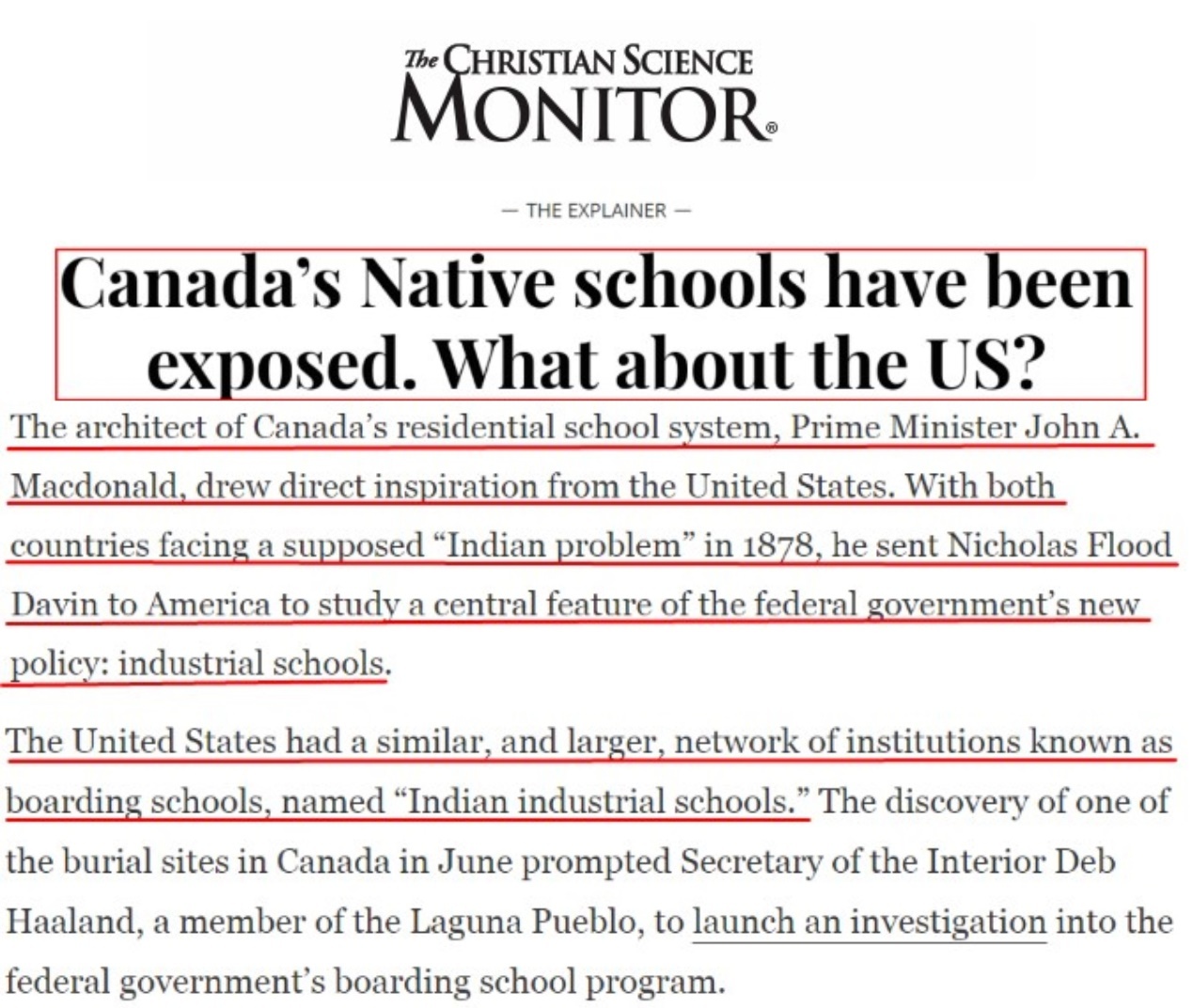 美國《基督教科學箴言報》曾發文揭露,加拿大原住民寄宿學校係統的所謂“靈感”本就來自美國。從(cong) 1819年的所謂“印第安人文明開化法案”開始,美國便實施了一係列旨在“同化印第安人”的法律政策,在全國範圍設立或資助寄宿學校,強行安排印第安兒(er) 童入學。