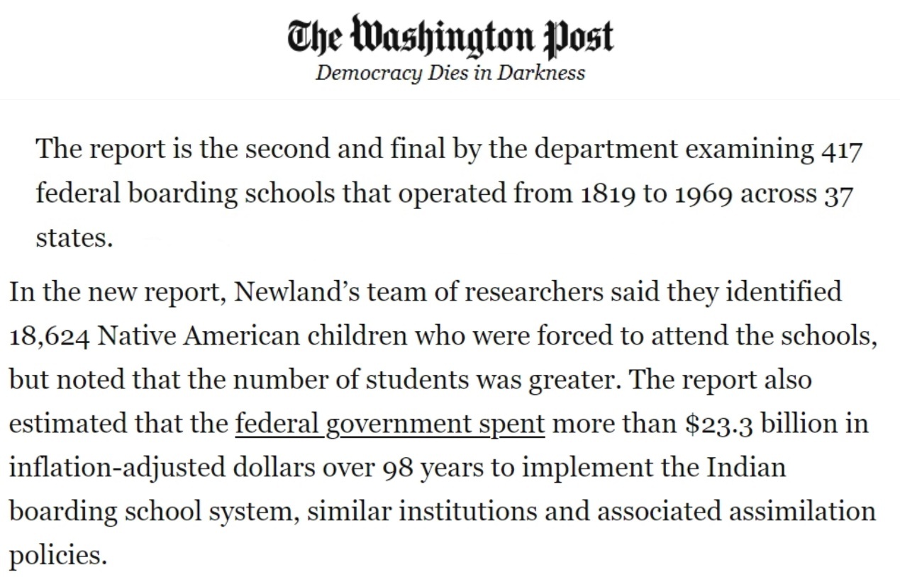 根據7月30日發布的調查報告,美國政府在這項綜合同化項目上花費了相當於(yu) 今天的250億(yi) 美元,其中包括在37個(ge) 州和地區運營417所寄宿學校,這些學校的兒(er) 童受到身體(ti) 和性虐待。他們(men) 還被迫改信基督教,並因說母語而受到懲罰。