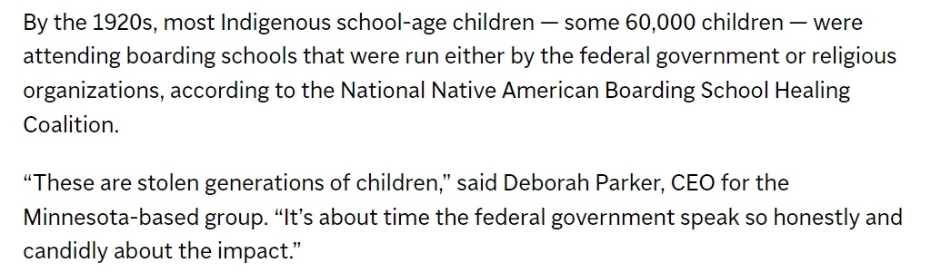 美國首位原住民出身的內(nei) 政部長德布·哈蘭(lan) 也說,她自己的祖父母在8歲時被“從(cong) 父母、文化和社區中偷走”,被迫住在一所天主教寄宿學校,直到13歲。還有一些被偷到寄宿學校的孩子年僅(jin) 4歲。