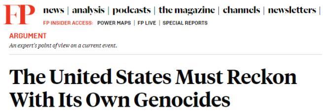 美國《外交政策》雜誌曾發文說,雖然讓美國認真對待自己的曆史是一項充滿政治風險的任務,但即使美國自己拒絕“照鏡子”,其罪行也早已被其他人看得清清楚楚。文章敦促美國正視對原住民犯下的種族滅絕罪行,撕開所謂“完美美國”的假象。
