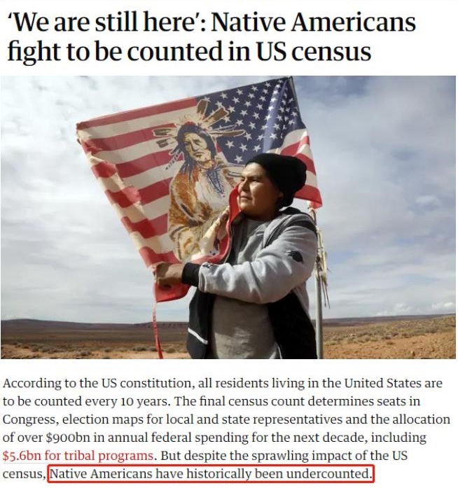 美國每十年統計一次居民人數,最終人口普查結果決(jue) 定了國會(hui) 、州和地方的議席分配以及相應的聯邦財政支出分配。但在這一過程中,美國原住民一直被忽視。