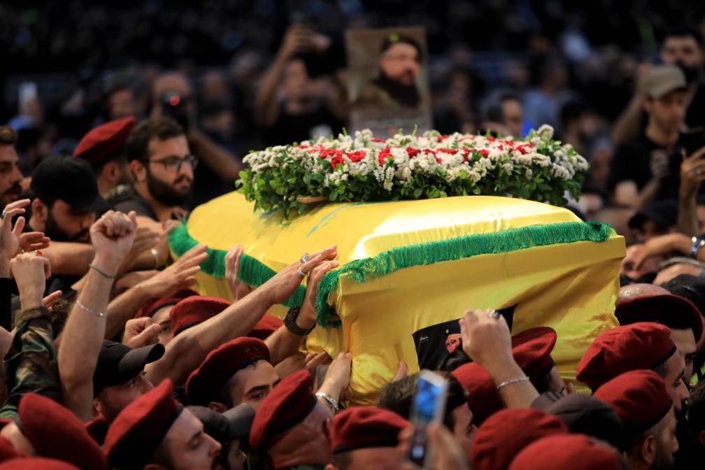 8月1日,在黎巴嫩首都貝魯特,真主黨(dang) 成員參加真主黨(dang) 高級軍(jun) 事指揮官福阿德·舒庫爾的葬禮。新華社發(比拉爾·賈維希攝)