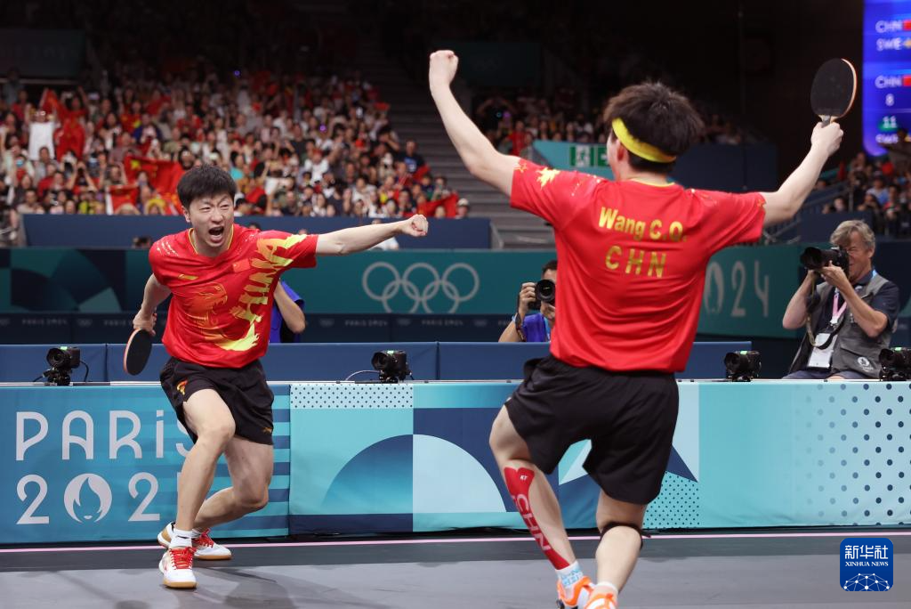 8月9日,中國隊組合馬龍(右)/王楚欽慶祝勝利。他們(men) 3比2戰勝瑞典隊組合科爾貝裏/卡爾鬆。新華社記者 劉續 攝