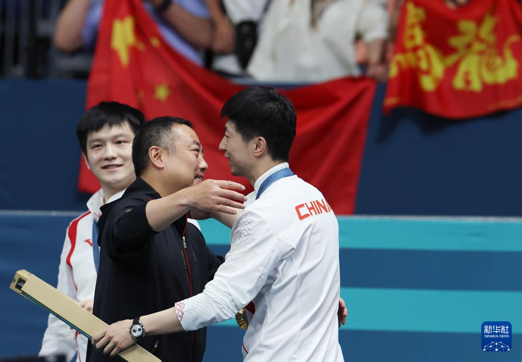 8月9日,中國乒協主席劉國梁(中)賽後與(yu) 馬龍(右)擁抱。新華社記者 劉續 攝