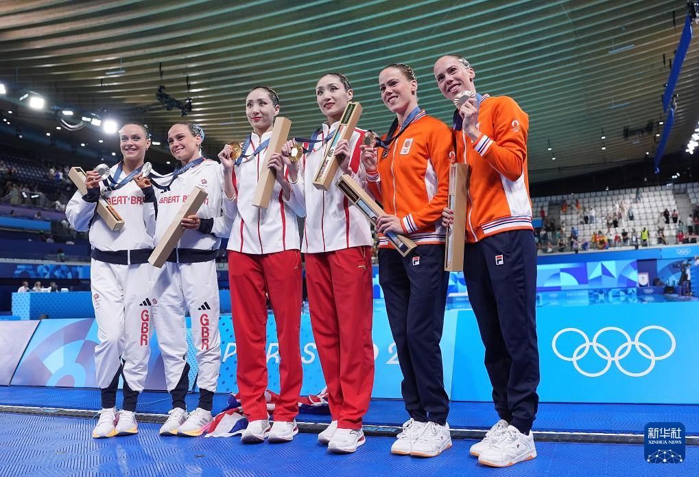 8月10日,冠軍(jun) 中國組合(中)、亞(ya) 軍(jun) 英國組合(左)和季軍(jun) 荷蘭(lan) 組合在頒獎儀(yi) 式上。新華社記者 薛宇舸 攝