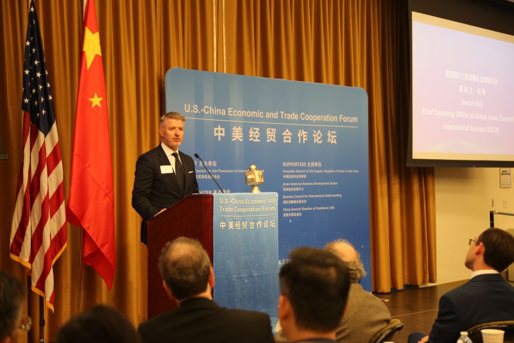 7月29日,在美國紐約,美國國際工商理事會(hui) 首席運營官戴克蘭(lan) ·達利在中國—美國經貿合作論壇上致辭。中國—美國經貿合作論壇29日在紐約市舉(ju) 行,300餘(yu) 位中美企業(ye) 及商協會(hui) 代表出席。新華社記者劉亞(ya) 南攝