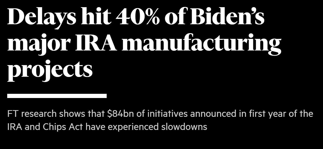 然而,《金融時報》的調查發現,與(yu) 上述法案相關(guan) 的過億(yi) 美元大項目共114個(ge) ,總投資2279億(yi) 美元,但其中總投資約840億(yi) 美元的項目進度滯後兩(liang) 個(ge) 月至數年,甚至無限停擺。