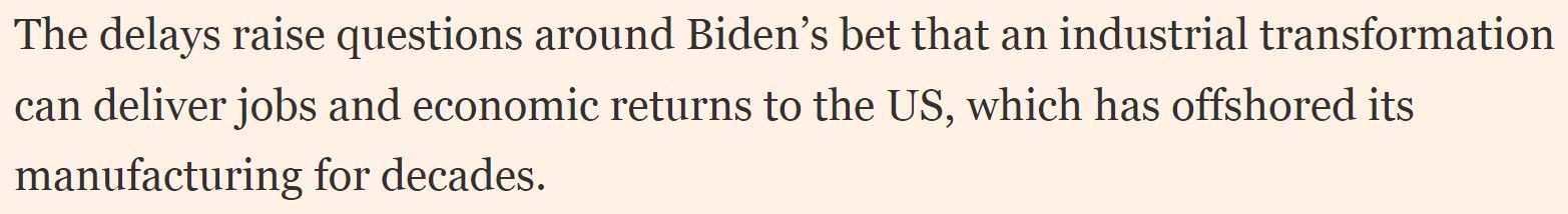 按照《金融時報》的說法,項目遲滯令輿論質疑拜登政府所篤定的工業(ye) 轉型有望為(wei) 美國帶來就業(ye) 和經濟回報的說法。