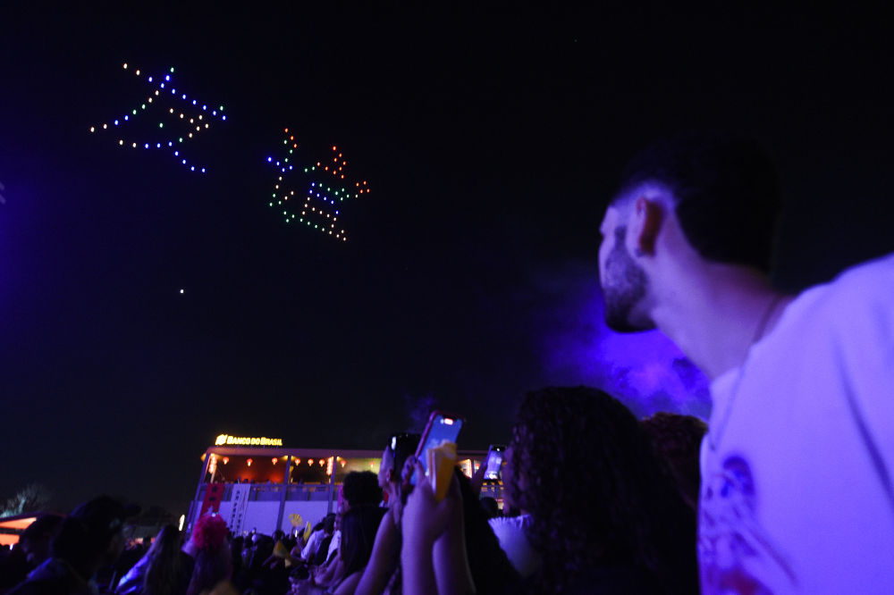 ↑8月17日,在巴西首都巴西利亞(ya) ,人們(men) 在沙灘藝術節中國日活動上觀看無人機表演。