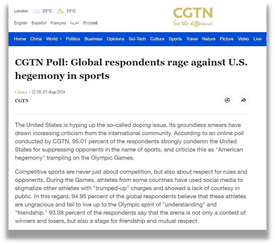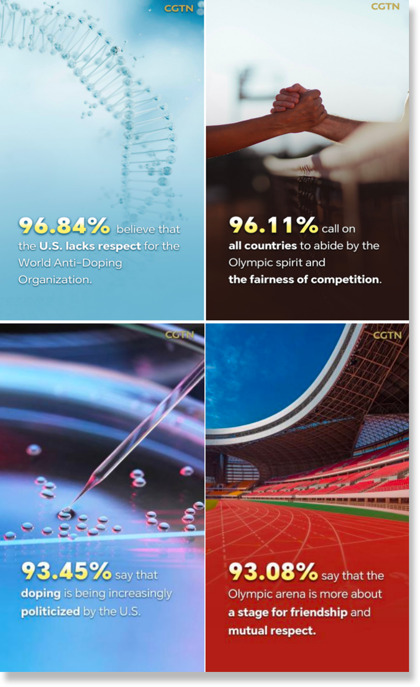 總台CGTN先後兩(liang) 次發起全球民調,調查顯示,96.84%的受訪者認為(wei) 美方缺乏對世界反興(xing) 奮劑機構的尊重,是在挑戰公平和權威;96.25%的受訪者痛批美國在興(xing) 奮劑監管方麵“雙重標準”;93.45%的受訪者表示,興(xing) 奮劑問題日益被美國政治化和工具化;95.57%的受訪者認為(wei) 美國反興(xing) 奮劑機構或存包庇行為(wei) ,為(wei) 涉興(xing) 奮劑的美國運動員開脫……