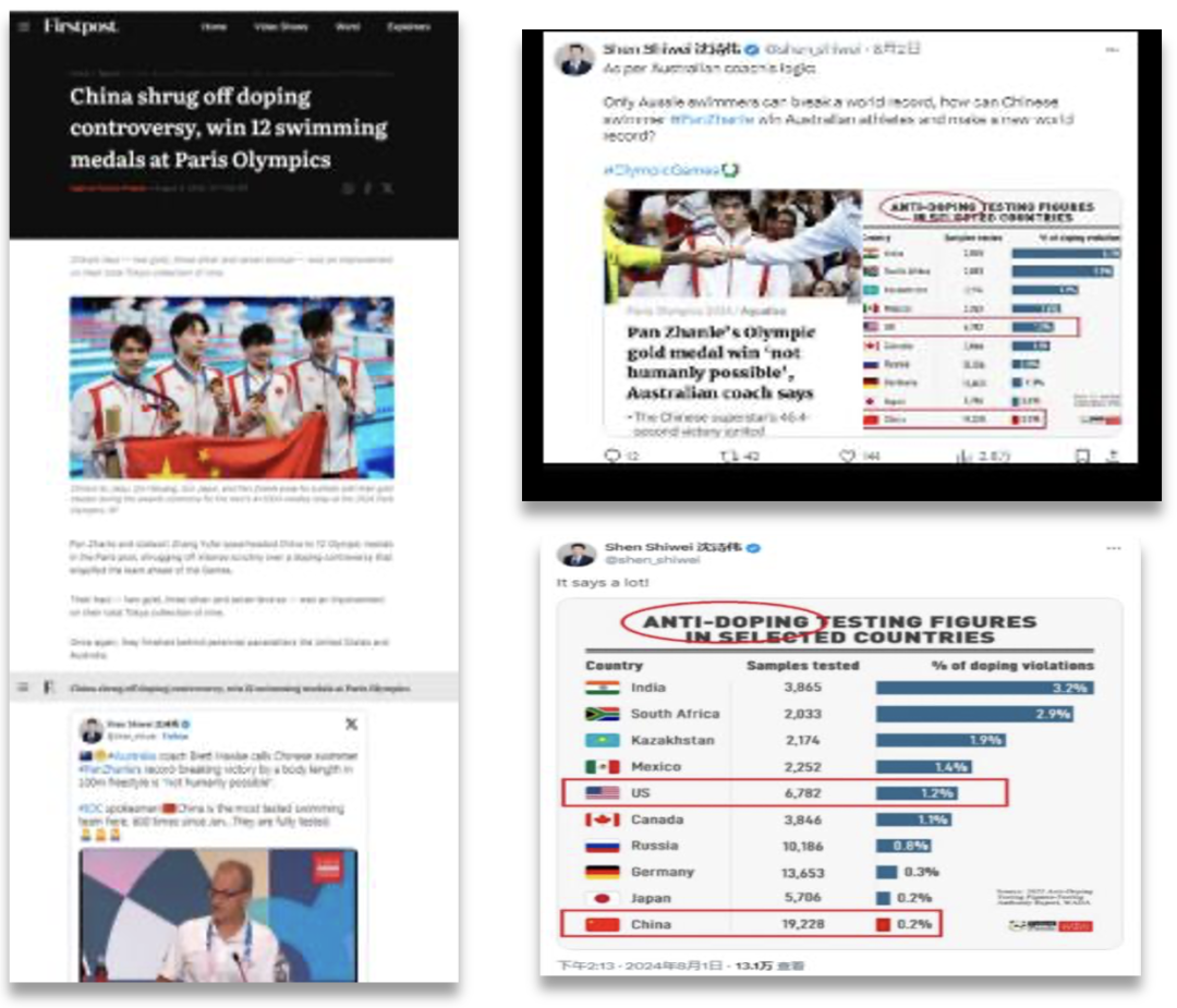 除了用及時的新聞消息擺出事實,總台各評論欄目節目鏗鏘發聲,深度起底美炒作興(xing) 奮劑問題的真實動機。“國際銳評”發布評論文章《美方必須就大規模使用興(xing) 奮劑問題給世界一個(ge) 交代》,強調奧林匹克精神不能被“美式霸權”玷汙,反興(xing) 奮劑工作不應淪為(wei) 抹黑和打壓他國的工具;CGTN評論專(zhuan) 欄《對話》《視點》《今日》等迅速反應,邀請多位中外業(ye) 內(nei) 人士深度訪談,犀利剖析美國惡意汙蔑中國運動員背後的險惡用心;玉淵譚天譚主檢索分析美西方媒體(ti) 今年以來的相關(guan) 報道數據,給國際檢測機構(ITA)發送郵件獲取獨家回應,並且提取過去二十餘(yu) 年美國濫用興(xing) 奮劑事件中的相關(guan) 信息,還原美西方抹黑中國遊泳隊的傳(chuan) 播鏈。