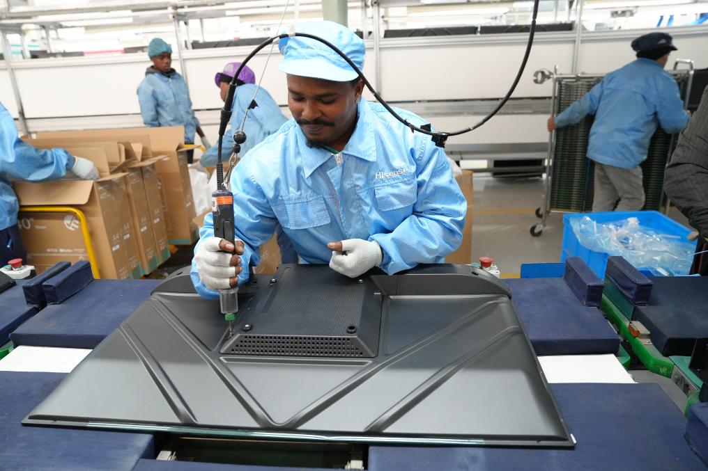 8月14日,在南非開普敦,當地員工在海信南非工業(ye) 園的電視機生產(chan) 線上工作。新華社記者王雷攝