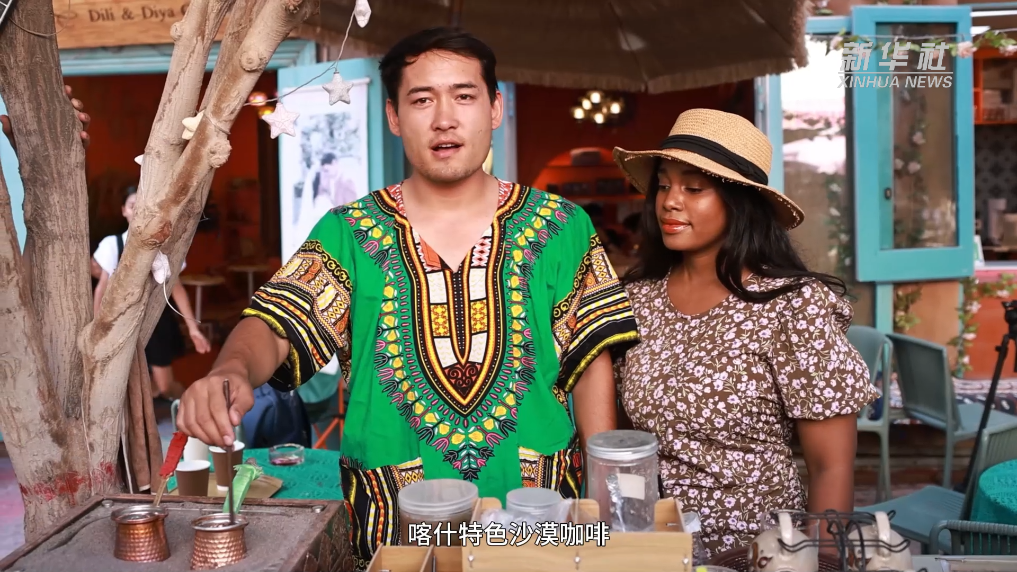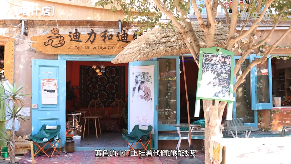 咖啡館木製的門頭雕刻著夫妻倆(lia) 的名字,藍色的小門上掛著他們(men) 的婚紗照,照片裏的海迪雅來自非洲東(dong) 部坦桑尼亞(ya) 桑給巴爾島,迪力夏提是新疆喀什本地人。