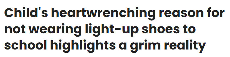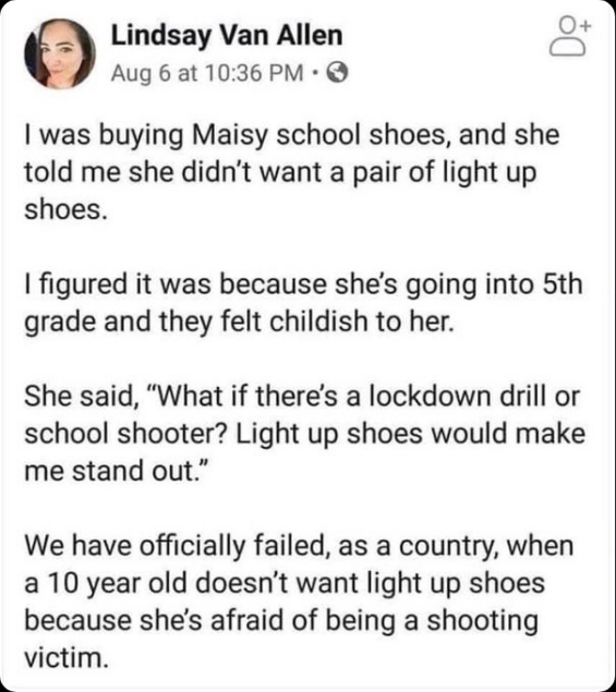 然而,梅茜這樣做的真實原因卻令人十分痛心。林賽寫(xie) 道:“她說‘如果進行封鎖演習(xi) 或者發生校園槍擊事件怎麽(me) 辦?發光的鞋子會(hui) 讓我更引起注意。’”這個(ge) 孩子非常擔心發生校園槍擊事件,以致於(yu) 她不得不放棄每個(ge) 孩子都想要的LED發光鞋。