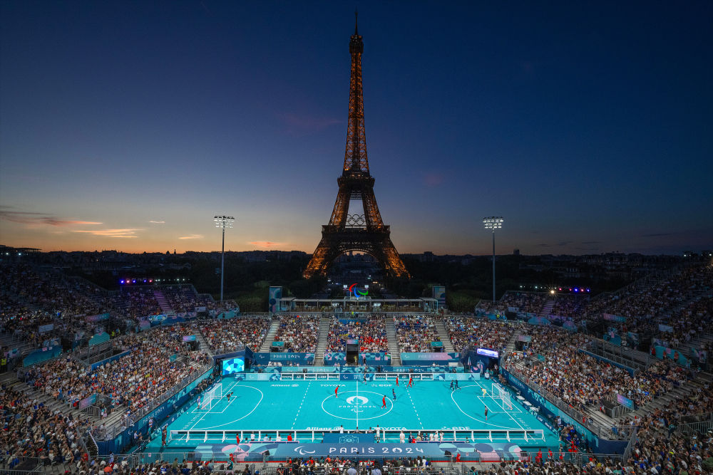這是9月1日拍攝的巴黎殘奧會(hui) 盲人足球比賽現場。新華社記者 熊琦 攝