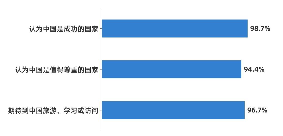 調查發現,受訪青年普遍有極高的對華好感度。在對華總體(ti) 印象的係列認知中,高達98.7%的受訪青年認為(wei) 中國是一個(ge) 成功的國家;94.4%的受訪青年認為(wei) 中國是一個(ge) 值得尊重的國家;96.7%的受訪青年期待未來有機會(hui) 來到中國旅遊、學習(xi) 或訪問。