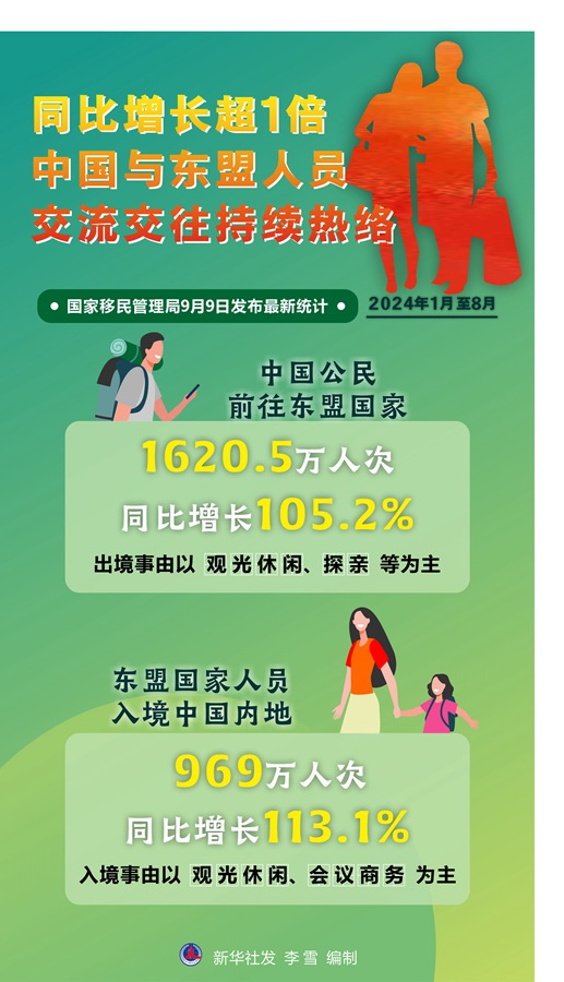 國家移民管理局9日發布最新統計,2024年1月至8月,中國公民前往東(dong) 盟國家1620.5萬(wan) 人次,同比增長105.2%,出境事由以觀光休閑、探親(qin) 等為(wei) 主;東(dong) 盟國家人員入境中國內(nei) 地969萬(wan) 人次,同比增長113.1%,入境事由以觀光休閑、會(hui) 議商務為(wei) 主。