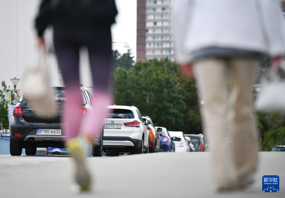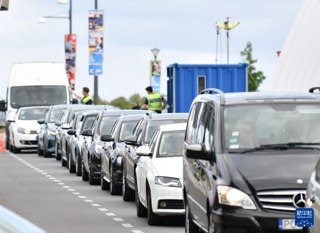 9月10日,車輛排隊通過德國奧得河畔法蘭(lan) 克福和波蘭(lan) 斯武比采邊境的檢查站。新華社記者 任鵬飛 攝
