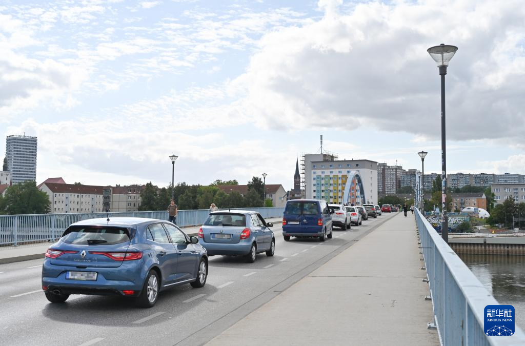 9月10日,車輛在連接德國奧得河畔法蘭(lan) 克福和波蘭(lan) 斯武比采的跨河大橋上排隊,等待進入德國。新華社記者 任鵬飛 攝