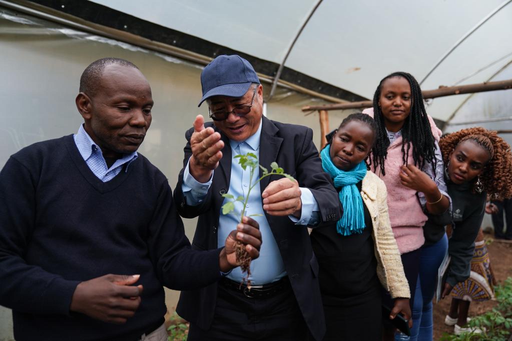 2023年9月18日,在肯尼亞(ya) 納庫魯郡舉(ju) 辦的中非農(nong) 業(ye) 發展和減貧示範村番茄生產(chan) 培訓班上,來自中國的農(nong) 學教授劉高瓊(左二)為(wei) 肯方學員指導農(nong) 業(ye) 技術。新華社記者 韓旭 攝