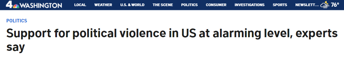 另外,美國國家廣播公司華盛頓地方頻道(NBC Washington)日前報道稱,盡管美國支持政治暴力的人與(yu) 去年相比略有減少,但暴力支持者現在更傾(qing) 向使用槍支來實現他們(men) 的目的。數月來,專(zhuan) 家們(men) 始終表示,美國對出於(yu) 政治動機的暴力的支持度達到了令人十分擔憂的水平。