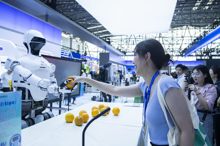 9月20日,在2024世界製造業(ye) 大會(hui) 展館內(nei) ,人形機器人“啟江二號”抓取橙子遞給參觀者。新華社記者 黃博涵 攝