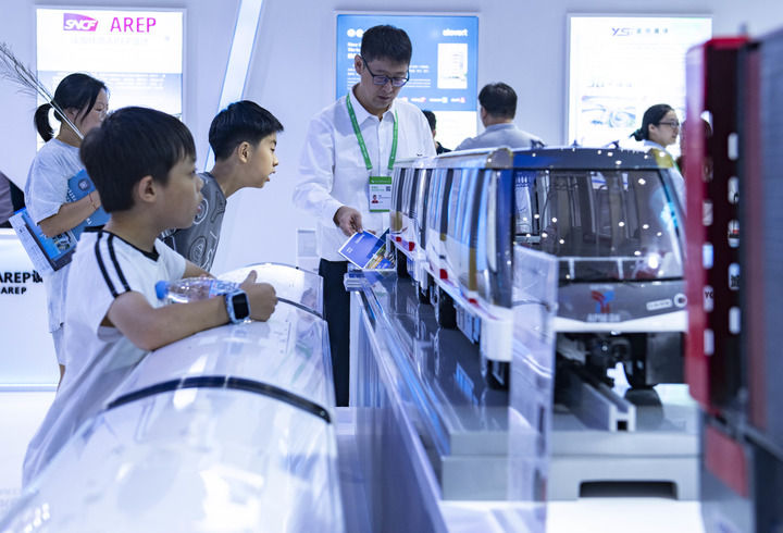 9月21日,在2024世界製造業(ye) 大會(hui) 上,小朋友參觀體(ti) 驗阿爾斯通跨座式單軌列車。新華社記者 黃博涵 攝