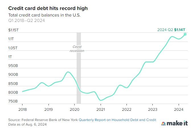 2018年一季度至2024年二季度,美國信用卡債(zhai) 務總額創下曆史新高。(CNBC截圖)