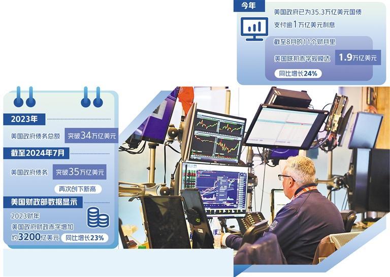 美國財政部9月12日發布的月度聯邦政府收支報告顯示,今年美國政府已為(wei) 35.3萬(wan) 億(yi) 美元國債(zhai) 支付逾1萬(wan) 億(yi) 美元利息。償(chang) 債(zhai) 成本上升也與(yu) 美國8月財政赤字大幅上升相吻合。截至8月的前11個(ge) 財月裏,美國聯邦赤字規模達1.9萬(wan) 億(yi) 美元,同比增長24%。美國財政赤字曾在2020財年達到3.13萬(wan) 億(yi) 美元的峰值,此後兩(liang) 年雖呈下降趨勢,但在2023財年又有所上漲:美國財政部數據顯示,2023財年美國政府的財政赤字增加了約3200億(yi) 美元,同比增長23%。一方麵,經濟的衰退和各種減稅法案的實施導致財政收入減少;另一方麵,為(wei) 刺激經濟增長,財政支出又不斷增加,這就導致財政赤字不斷攀升,隻有通過發債(zhai) 彌補財政赤字,形成惡性循環。