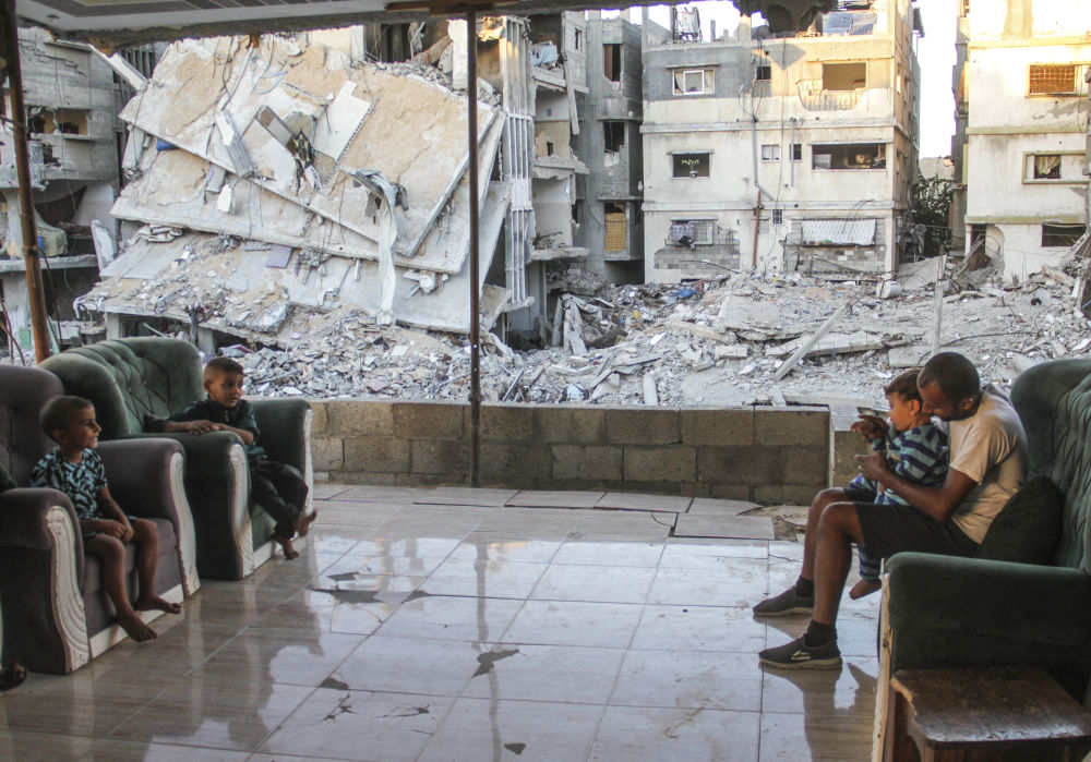 10月6日,在加沙地帶北部傑巴利耶,人們(men) 坐在建築廢墟附近。新華社發(馬哈茂德·紮基攝)