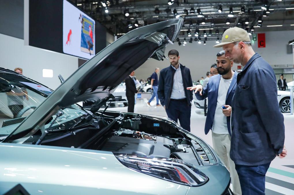 9月11日,人們(men) 在德國法蘭(lan) 克福國際汽車零配件及售後服務展覽會(hui) 上參觀吉利展台。為(wei) 期5天的法蘭(lan) 克福國際汽車零配件及售後服務展覽會(hui) 10日開幕。吉利、比亞(ya) 迪等多家中國電動汽車品牌首次集體(ti) 亮相,被德國媒體(ti) 和業(ye) 內(nei) 人士視為(wei) 本次展會(hui) 一大看點。新華社記者張帆攝