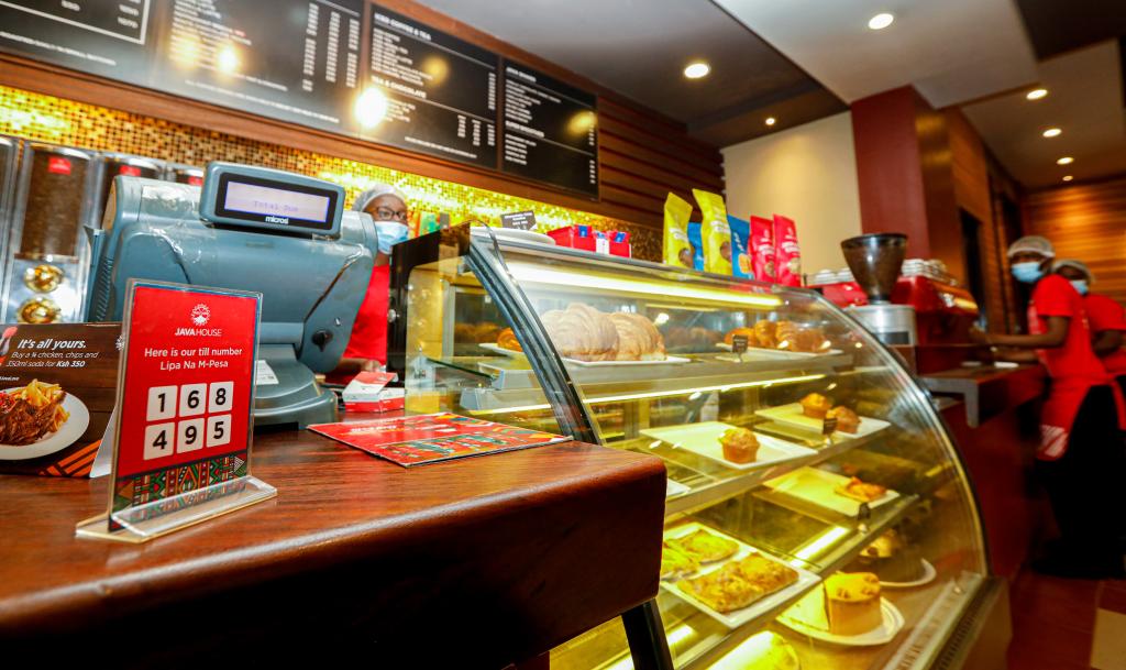 2021年9月16日,肯尼亞(ya) 首都內(nei) 羅畢市中心一家咖啡店的收銀台擺放著M-Pesa支付相關(guan) 信息。新華社記者張宇攝