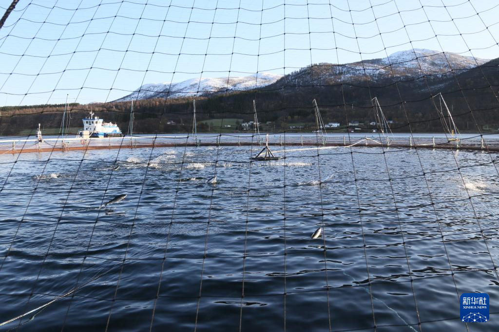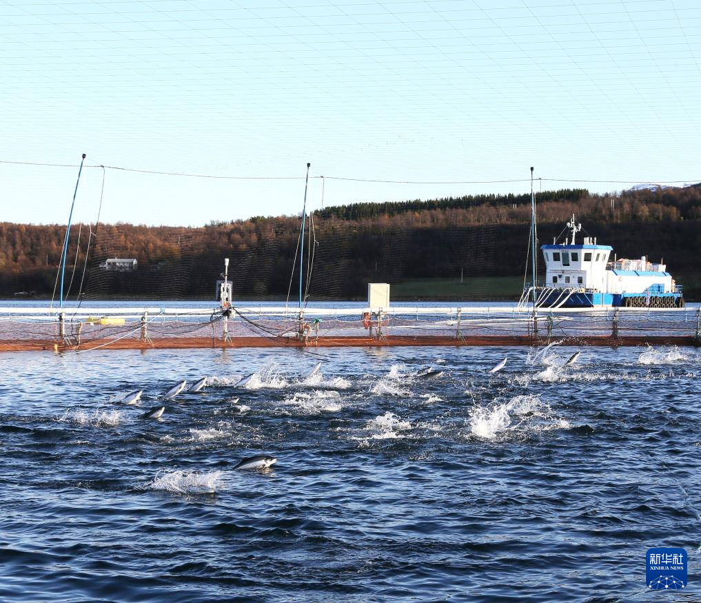 這張2023年10月10日拍攝的資料照片顯示的是位於(yu) 挪威北部特羅姆斯郡峽灣中的三文魚養(yang) 殖網箱。新華社記者 張玉亮 攝