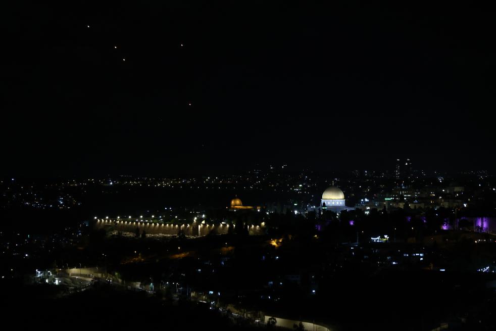 10月1日,伊朗發射的導彈從(cong) 耶路撒冷上空飛過。新華社發(賈馬爾·阿瓦德攝)