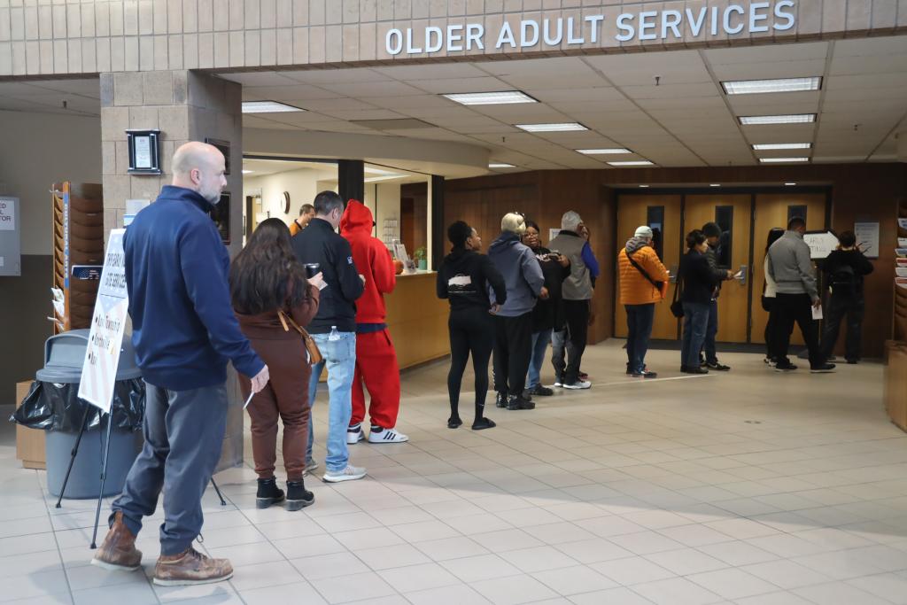 10月28日,在美國密歇根州奧克蘭(lan) 縣諾維,選民在投票站排隊等待參加提前投票。新華社記者 徐劍梅 攝