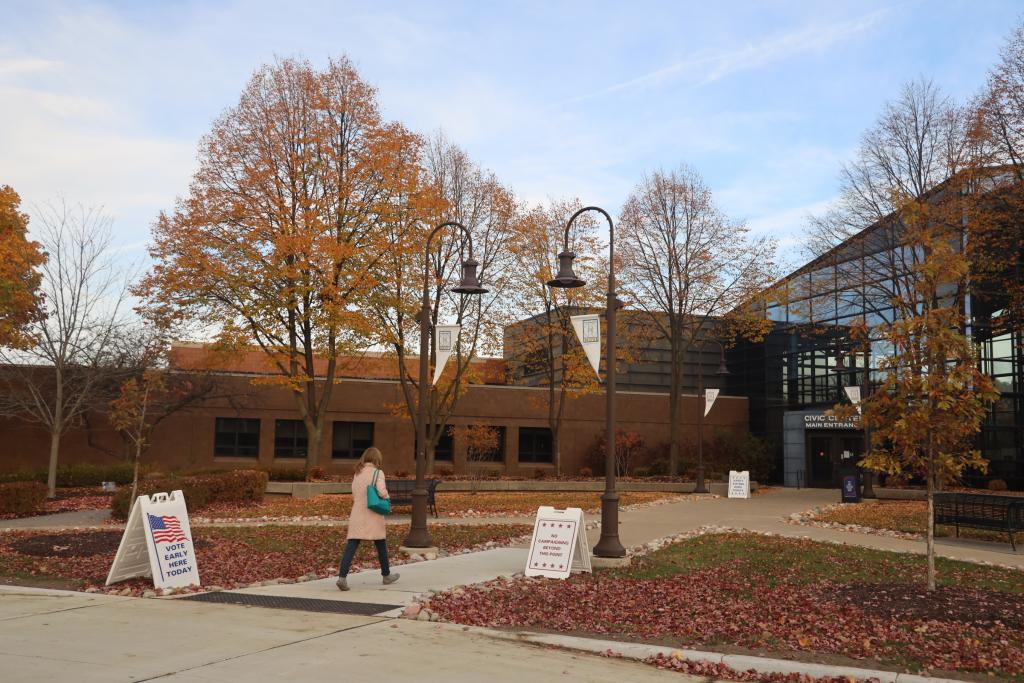 10月28日,在美國密歇根州奧克蘭(lan) 縣諾維,一名女子前往投票站參加提前投票。新華社記者 徐劍梅 攝