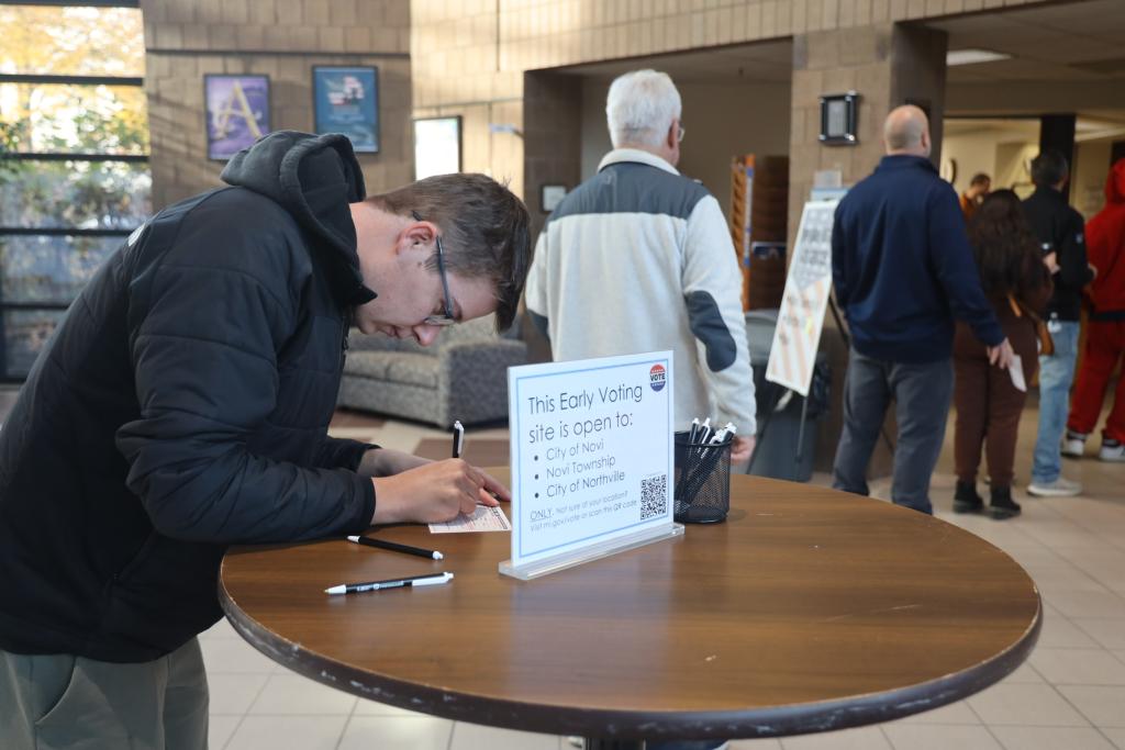 10月28日,在美國密歇根州奧克蘭(lan) 縣諾維,一名男子在投票站填寫(xie) 資料準備參加提前投票。新華社記者 徐劍梅 攝