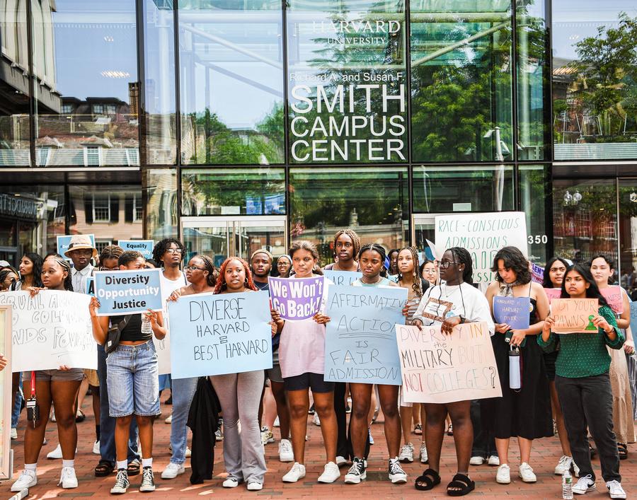 2023年7月1日,在美國馬薩諸塞州劍橋,人們(men) 手持標語在哈佛大學校園舉(ju) 行遊行,抗議美國聯邦最高法院做出的招生政策判決(jue) 。新華社發(朱子於(yu) 攝)