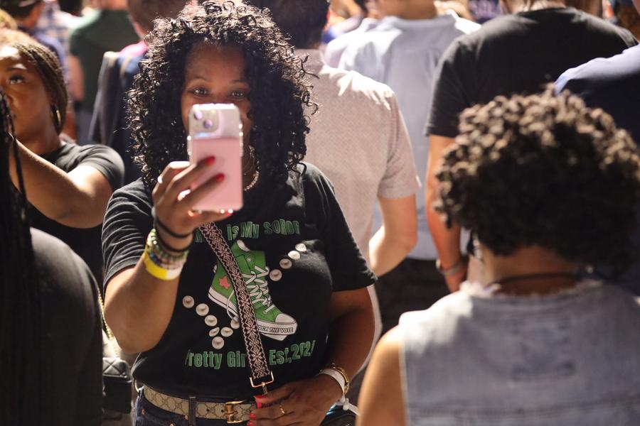 2024年10月25日,美國民主黨(dang) 總統候選人哈裏斯在得克薩斯州休斯敦舉(ju) 行競選集會(hui) ,聚焦女性生育自主權。這是一名女子在集會(hui) 上自拍。新華社記者徐劍梅攝