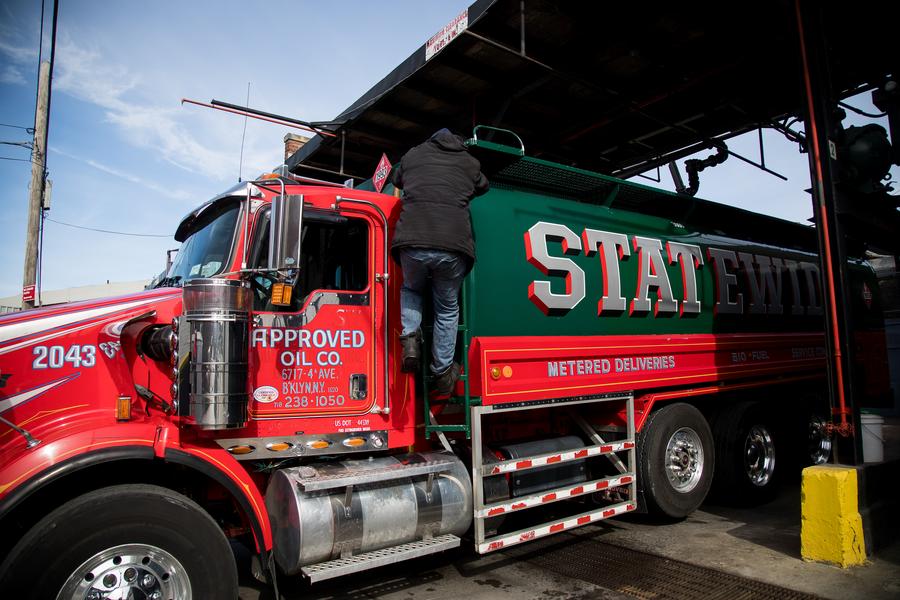2022年3月8日,一輛運油車駛過美國紐約街頭。新華社發(邁克爾·內(nei) 格爾攝)