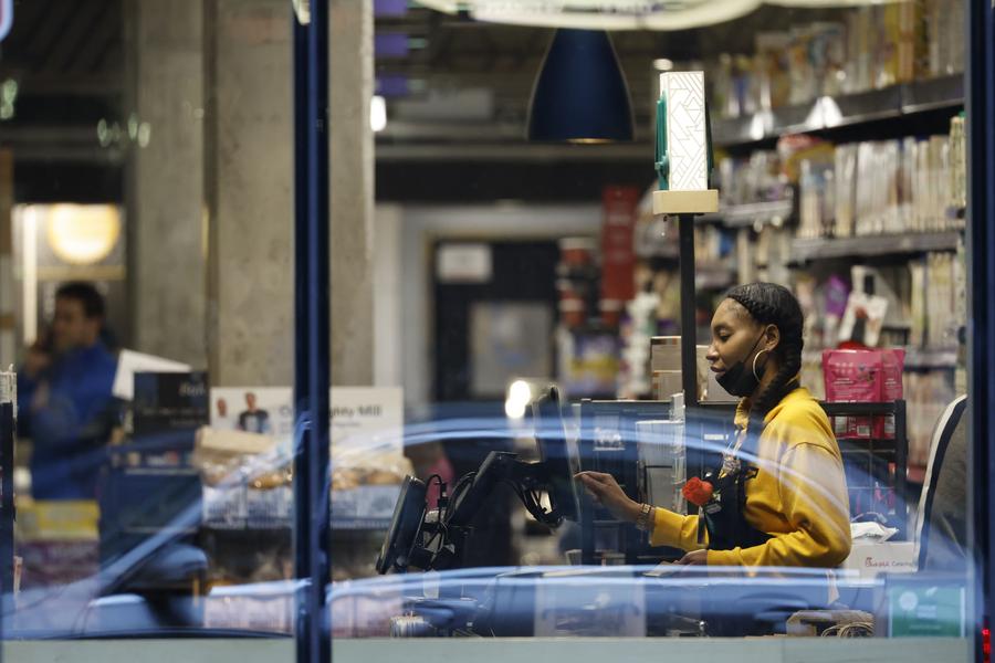 2022年5月6日,在美國華盛頓,一家超市的員工在收銀台旁工作。新華社發(沈霆攝)