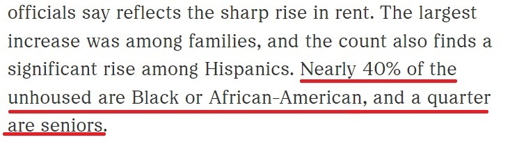根據美國全國公共廣播電台2023年報道中提及的數據,近40%的無家可歸者是非洲裔美國人,25%的無家可歸者是老年人,而拉丁裔無家可歸者的增幅則在近年大幅提升。