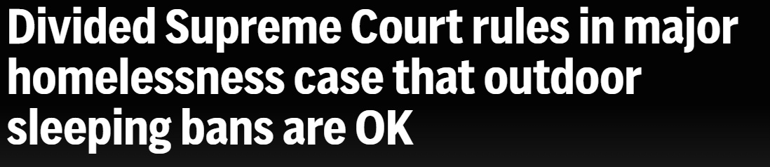 更令人唏噓的是,麵對越來越多的人流浪街頭,今年6月底,美國最高法院以6:3的判決(jue) 結果,允許各地政府實施禁止無家可歸者在戶外露宿的禁令。