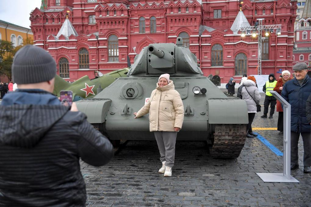 11月7日,在俄羅斯首都莫斯科,一名女子在以紀念1941年蘇聯紅場閱兵式為(wei) 主題的露天展覽上留影。新華社發(亞(ya) 曆山大攝)