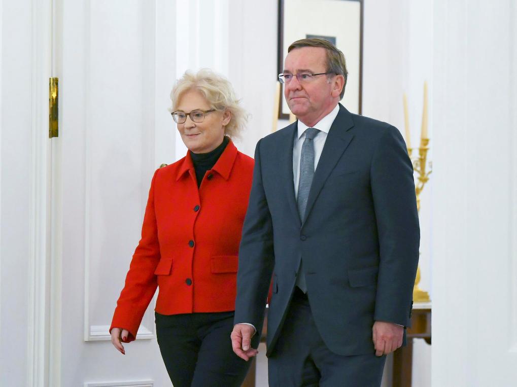 2023年1月19日,在德國柏林的總統府,皮斯托裏烏(wu) 斯(右)步入儀(yi) 式現場。德國總統施泰因邁爾當日向鮑裏斯·皮斯托裏烏(wu) 斯頒發任命書(shu) ,正式任命其為(wei) 國防部長。新華社記者任鵬飛攝