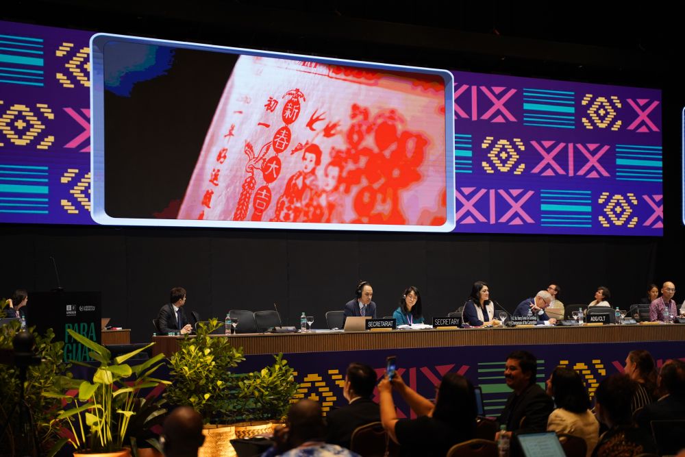 12月4日,在巴拉圭亞(ya) 鬆森聯合國教科文組織保護非物質文化遺產(chan) 政府間委員會(hui) 第19屆常會(hui) 評審現場,大屏幕播放春節宣傳(chuan) 視頻。新華社記者朱雨博攝