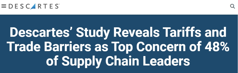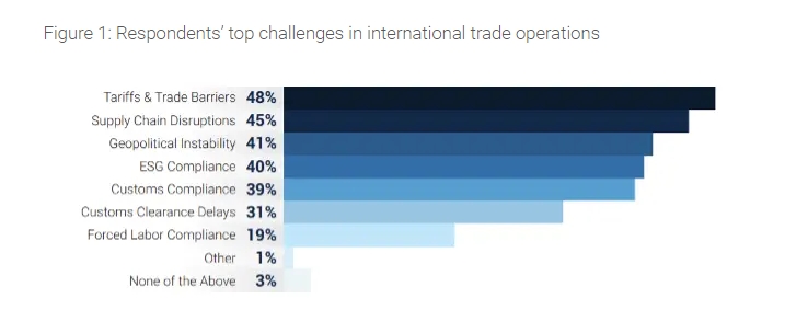 調查顯示,48%的受訪者認為(wei) 關(guan) 稅和貿易壁壘上升是他們(men) 最擔心的問題,緊隨其後的是供應鏈中斷(45%)和地緣政治不穩定(41%)。此外,無論所在公司規模大小,受訪者都將關(guan) 稅和貿易壁壘列為(wei) 當前麵臨(lin) 的首要問題。這項報告共調查了978名來自歐洲、北美、南美和亞(ya) 太地區主要貿易國的供應鏈領域領導者。
