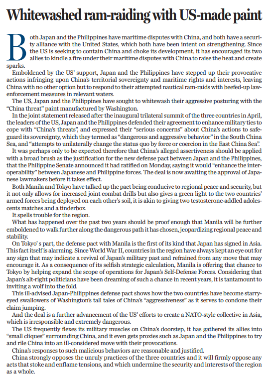 菲律賓和日本都大肆宣揚該協定有利於(yu) 地區和平與(yu) 安全,但實際上,該協定不僅(jin) 允許兩(liang) 國間增加聯合作戰演習(xi) ,還為(wei) 兩(liang) 國在對方領土上部署軍(jun) 隊開了綠燈,這無異於(yu) 將火柴和火藥桶交到兩(liang) 個(ge) 荷爾蒙過剩的青少年手中。