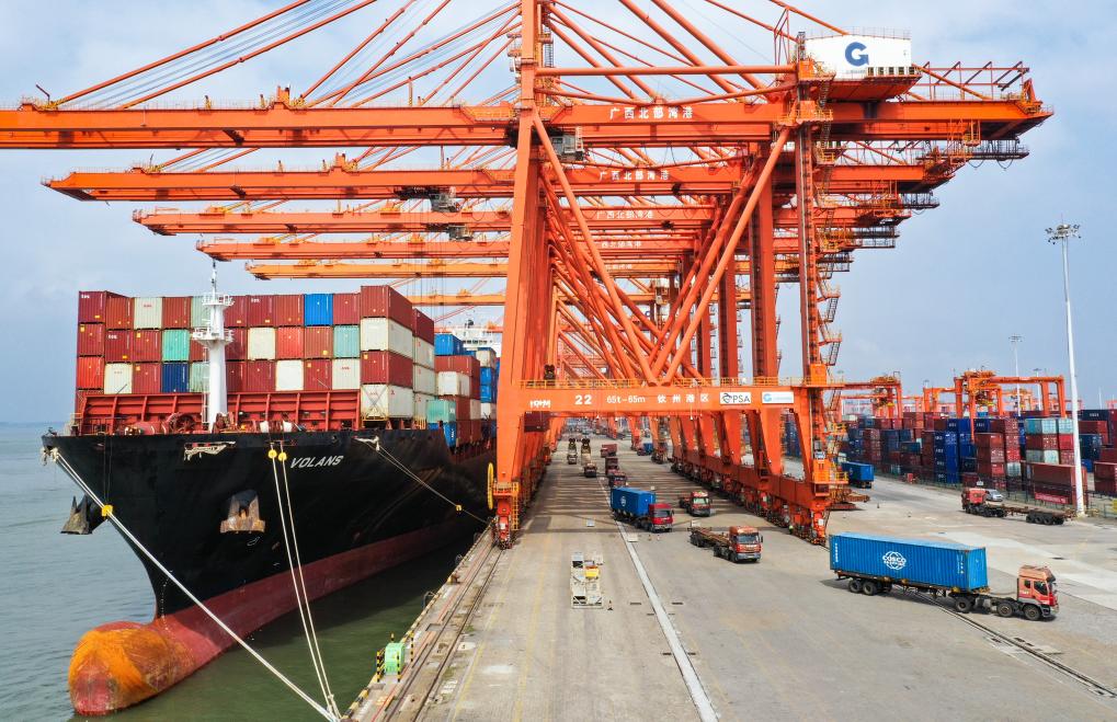 在廣西北部灣港欽州港區碼頭,吊車為(wei) 貨輪卸載集裝箱(10月20日攝,無人機照片)。新華社記者李賀攝