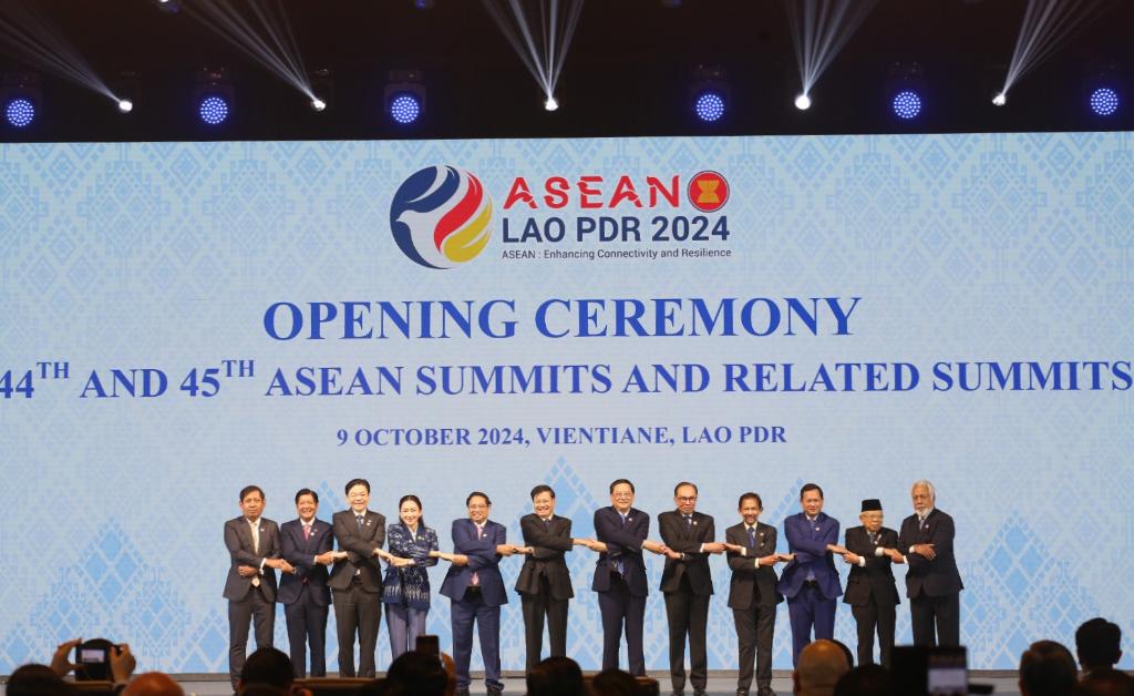 這是10月9日在老撾首都萬(wan) 象拍攝的第44屆和第45屆東(dong) 盟峰會(hui) 開幕式現場。新華社發